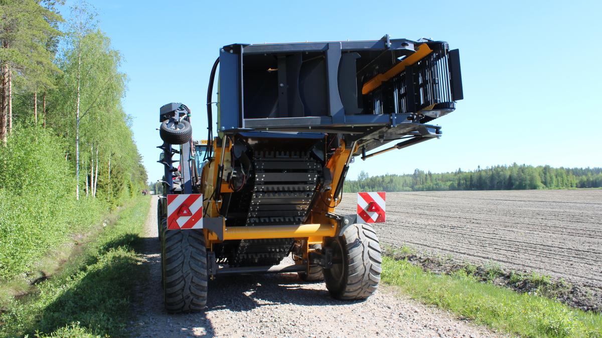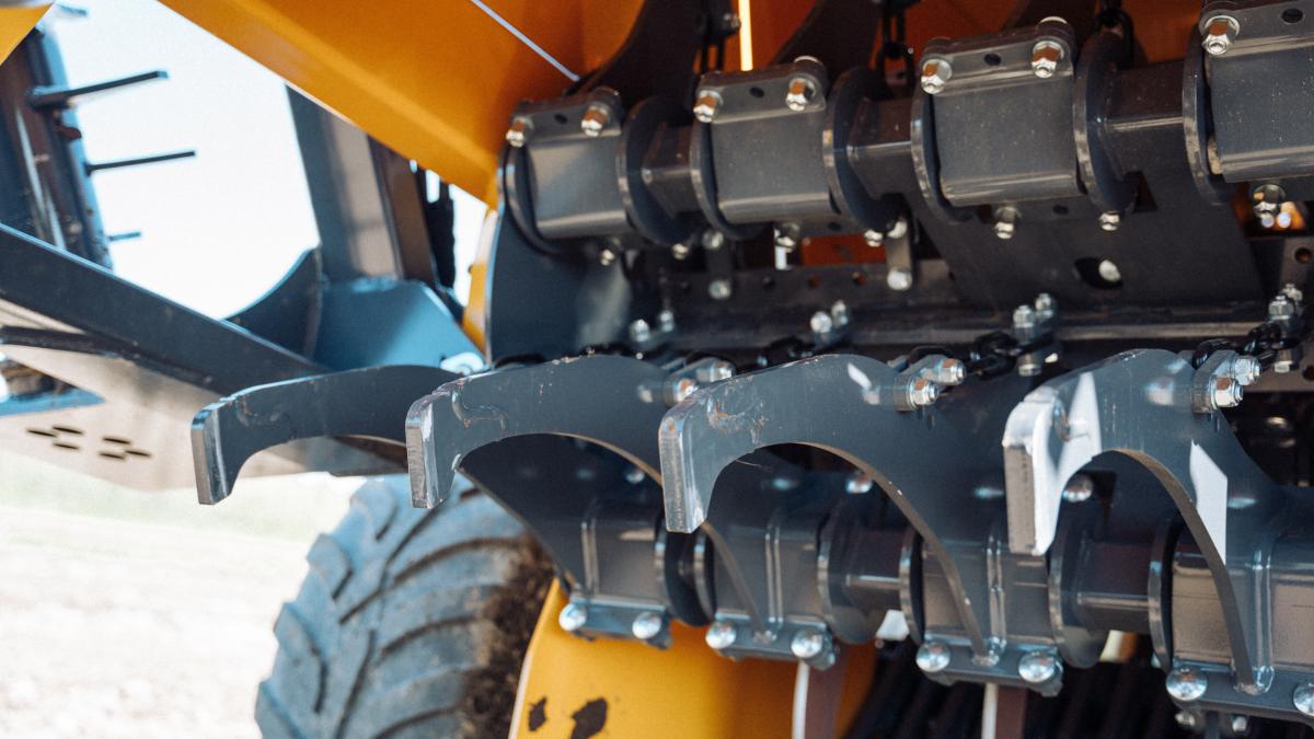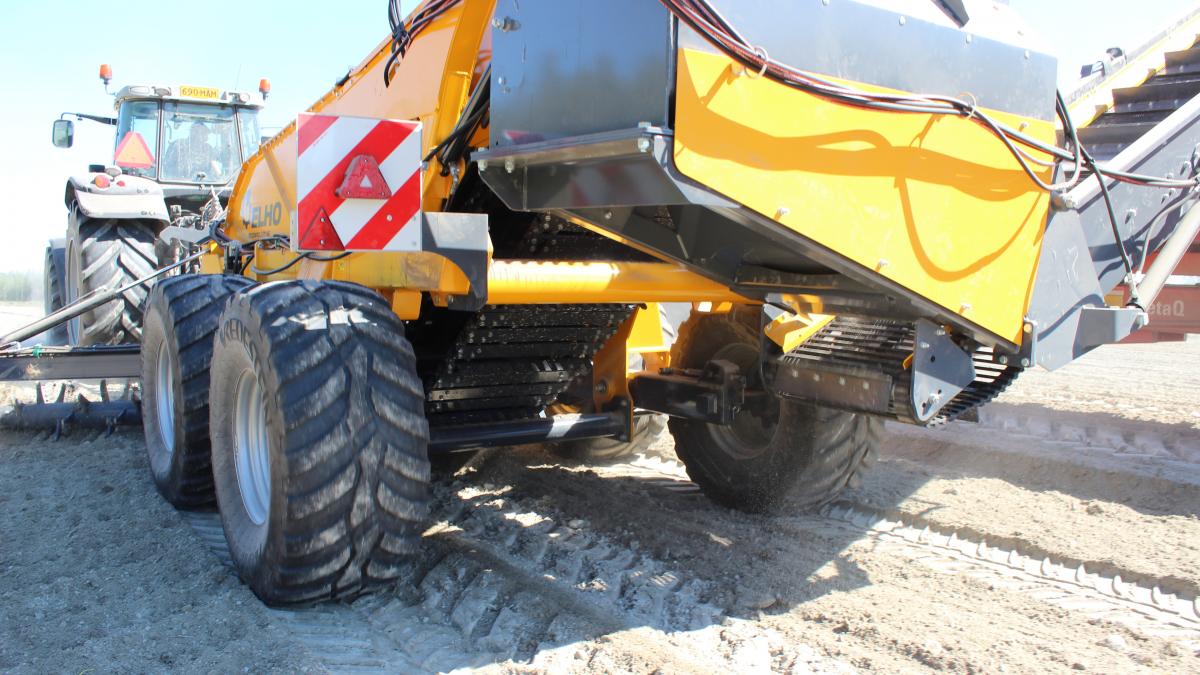 Ez a gép nem gyűjtőtartállyal, hanem folyamatos üzemű szállítószalaggal van szerelve, így a köveket azonnal a szerelvény mellett haladó pótkocsira hordja.