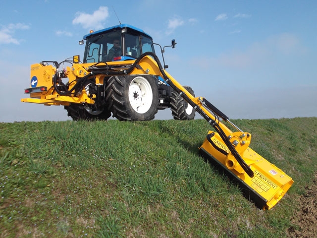 Traktorok 3-pontjára csatlakoztatható, karos kihelyezésű rézsűzúzók.
